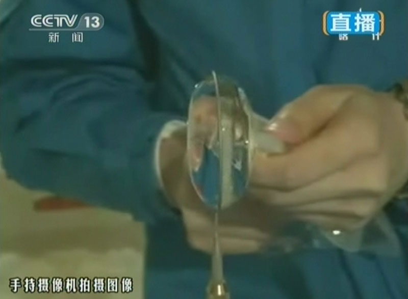 6月20日上午10時許,神舟十號航天員進行中國首次太空授課,女航天員王亞平擔任主講,成為中國首位“太空教師”。圖為王亞平進行“水膜”演示。(視頻截圖)