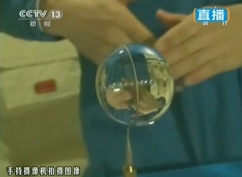6月20日上午10時許,神舟十號航天員進(jìn)行中國首次太空授課,女航天員王亞平擔(dān)任主講,成為中國首位“太空教師”。圖為王亞平“玩水球”。(視頻截圖)