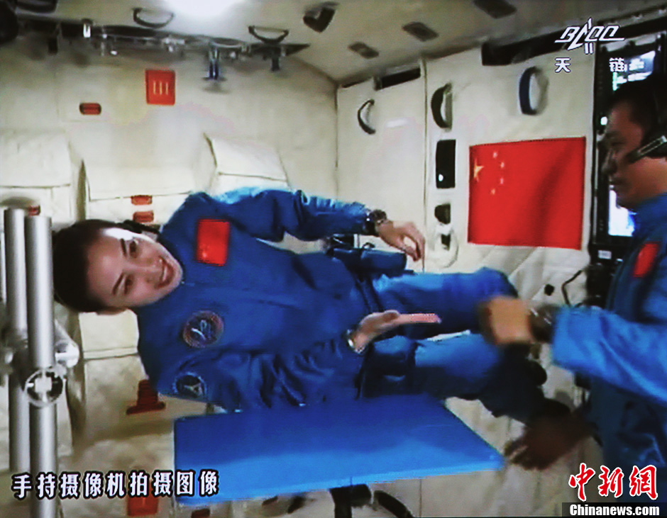 6月20日10時許,神舟十號航天員在天宮一號開展基礎(chǔ)物理實驗,為青少年進行中國首次太空授課。圖為王亞平講授太空失重提供條件下的方位感演示。中新社發(fā) 秦憲安 攝
