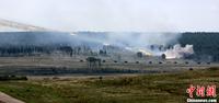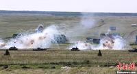 8月12日,“和平使命-2013”聯(lián)合反恐軍演中俄兩軍參演部隊在切巴爾庫爾合同訓練場舉行全員全要素實兵協(xié)同訓練。雙方共出動官兵近900人,坦克、步戰(zhàn)車、直升機等武器裝備約130臺,雙方導演部總導演——俄中部軍區(qū)司令員波格諾夫斯基和沈陽軍區(qū)副司令員石香元,共同到演習地觀摩并指導兩軍訓練。圖為中方坦克戰(zhàn)車對恐怖武裝力量實施火力打擊。中新社發(fā) 李祥輝 攝