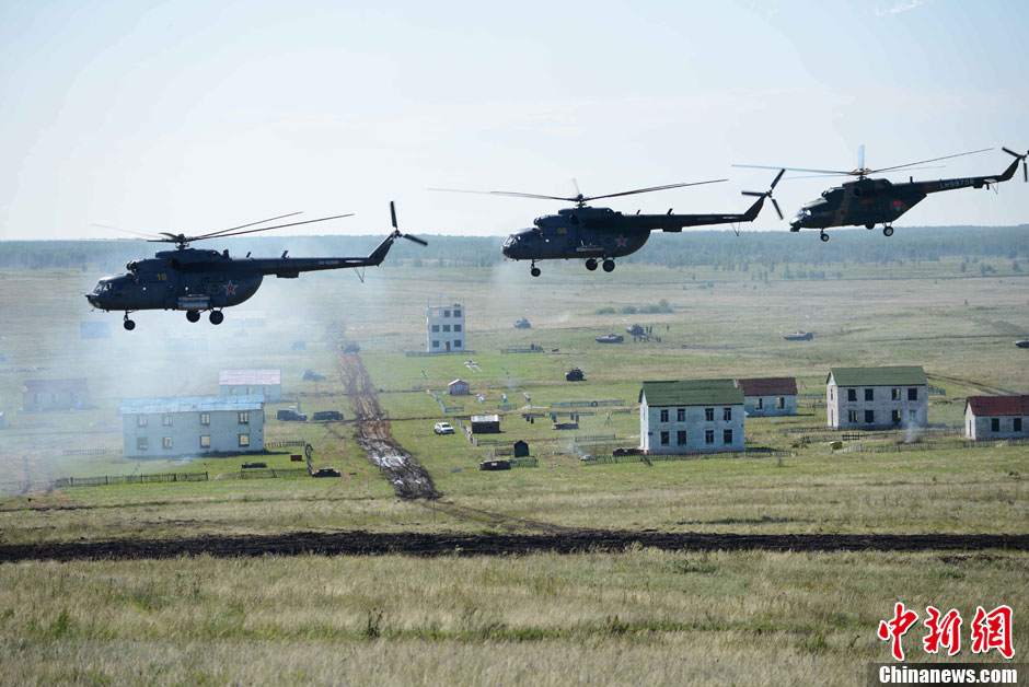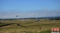 8月12日12時(shí)(北京時(shí)間下午2時(shí)),“和平使命-2013”中俄聯(lián)合反恐軍事演習(xí),在俄羅斯切巴爾庫爾合同訓(xùn)練場進(jìn)行了實(shí)兵實(shí)彈協(xié)同訓(xùn)練。圖為中方武裝直升機(jī)發(fā)射干擾彈隱蔽接敵。中新社發(fā) 譚長俊 攝