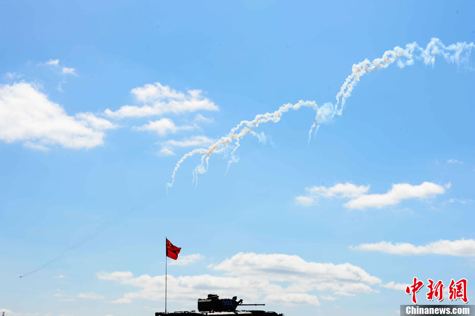 8月12日12時(北京時間下午2時),“和平使命-2013”中俄聯(lián)合反恐軍事演習(xí),在俄羅斯切巴爾庫爾合同訓(xùn)練場進行了實兵實彈協(xié)同訓(xùn)練。圖為陸空協(xié)同對敵實施打擊。中新社發(fā) 譚長俊 攝