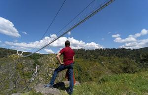 當(dāng)?shù)貢r(shí)間2021年5月2日,葡萄牙阿羅卡,世界最長(zhǎng)人行懸索橋“516 Arouca”向民眾開(kāi)放。據(jù)報(bào)道,這座橋全長(zhǎng)516米,位于河流上方175米,橋面由金屬構(gòu)建打造,能直接透過(guò)橋面看到峽谷。 圖片來(lái)源:ICphoto