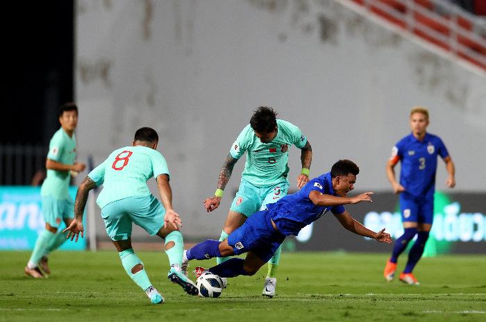 當(dāng)?shù)貢r間11月16日,在世預(yù)賽36強賽C組首輪角逐中,中國男足客場2:1勝泰國隊。據(jù)悉,中國隊所在小組的對手是韓國隊、泰國隊和新加坡隊,四支球隊將進行主客場循環(huán)賽。圖為中國隊球員武磊(左)與泰國隊球員在比賽中。