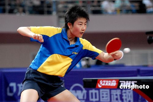 2007年10月26日,第六屆全國城市運動會乒乓球女子單打決賽在武漢洪山體育館舉行。繼半決賽擊敗世乒賽女單冠軍郭躍后,成都市代表隊小將丁寧奮力拼博,又以4:2力克另一名世界名將、濟南市代表隊的李曉霞,獲乒乓球女子單打冠軍,摘取了“六城會”女子乒乓球單打決賽金牌。中新社發(fā) 楚天行 攝