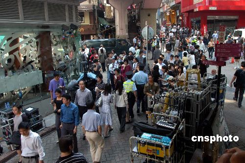 11月9日,好萊塢電影《新蝙蝠俠之黑夜之神》,在香港中環(huán)擺花街取景拍攝,道路兩旁都擺放了拍攝器材。吸引大批市民圍觀。中新社發(fā) 譚達(dá)明 攝