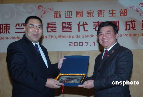 十一月十二日晚,澳門社會文化司司長崔世安在旅游塔宴請國家衛(wèi)生部代表團(tuán)及本澳醫(yī)療衛(wèi)生團(tuán)體代表,歡迎陳竺部長率領(lǐng)的國家衛(wèi)生部代表團(tuán)訪澳。圖為崔世安司長(左)向陳竺部長(右)贈送禮品。 中新社發(fā) 史利 攝