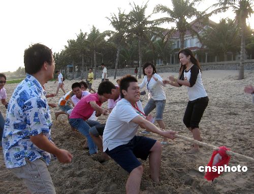 第二屆“歡聚海南大學(xué)”兩岸大學(xué)生冬令營11月13日舉行“深深相連”沙灘拔河比賽活動。圖為臺灣學(xué)生奮力拔河,粉絲團在旁邊吶喊助威。中新社發(fā) 彭小云 攝