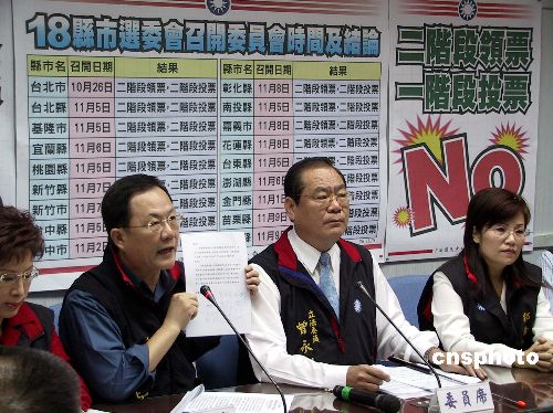 中國國民黨“立法院”黨團(tuán)十一月十四日表示,支持十八個縣市選舉委員會的決定,希望明年“立委”選舉與“公投”同日舉行時,采“二階段領(lǐng)票,二階段投票”方式,讓選舉順暢單純。圖為國民黨“立委”丁守中出示全臺灣二十五個縣市議會議長的共同聲明,他們表示支持這一投票方式。中新社發(fā) 劉舒凌 攝