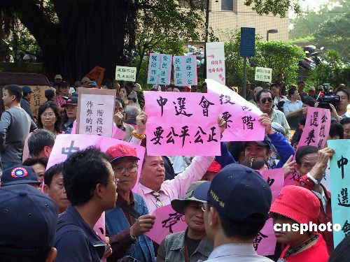 臺灣“中選會”委員會議十一月十六日晚表決確定,明年“立委”選舉合并兩項“公投”舉行,將采“分桌領(lǐng)票、一階段投、圈票方式”進(jìn)行,投錯票匭選票屬有效票。圖為當(dāng)天下午臺灣民眾到“中選會”所在辦公大樓下表達(dá)訴求,希望選舉能公平公正進(jìn)行。據(jù)了解,在“中選會”的一項意見調(diào)查中,臺灣二十五縣市選委會當(dāng)中的多數(shù)支持“二階段領(lǐng)、投票”模式。中新社發(fā) 劉舒凌 攝