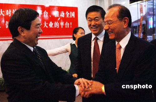 十一月十七日,福建省委常委、常務副省長張昌平(中)、漳州市市長李建國(左)在漳州與中國國民黨副主席林豐正(右)交談甚歡。第九屆海峽兩岸花卉博覽會將于十八日在福建漳州隆重開幕,屆時,島內(nèi)外五百多名臺商將出席盛會。中新社發(fā) 王東明 攝