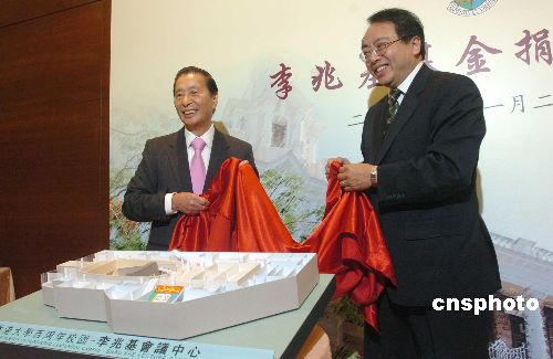 11月22日,香港恒基兆業(yè)地產(chǎn)有限公司主席李兆基博士捐贈(zèng)五億港元予香港大學(xué),以促進(jìn)港大未來(lái)的發(fā)展計(jì)劃,會(huì)上李兆基博士(左)與香港大學(xué)校長(zhǎng)徐立之教授為“香港大學(xué)百周年校園---李兆基會(huì)議中心”模型舉行揭幕儀式,新校園計(jì)劃于2011至2012年落成。中新社發(fā) 鄧慶樂(lè) 攝