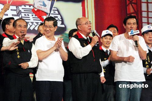 11月24日,中國國民黨在臺灣中部的嘉義市舉行萬人造勢活動,紀(jì)念該黨成立一百一十三周年,也為明年臺灣的兩次重要選舉拉抬聲勢。圖為馬英九、蕭萬長、吳伯雄、王金平等全體與會者高唱《我們都是一家人》、《愛拚才會贏》等歌。整個造勢活動突出“拚經(jīng)濟(jì)、顧生活”的訴求和“以臺灣為主,對人民有利”的主題。中新社發(fā) 黃少華 攝