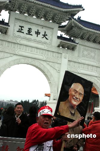 十二月五日,因臺(tái)灣教育部門(mén)執(zhí)意拆除臺(tái)北“中正紀(jì)念堂”牌樓“大中至正”四字引發(fā)的風(fēng)波升級(jí),反對(duì)者與支持者在現(xiàn)場(chǎng)爆發(fā)數(shù)波沖突。圖為一位老者舉著蔣介石畫(huà)像,對(duì)當(dāng)局將要拆牌表達(dá)強(qiáng)烈抗議。中新社發(fā) 董會(huì)峰 攝