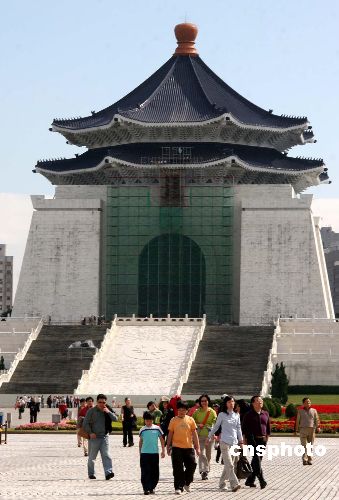 十二月十日,因更換牌匾封館多日的臺北“中正紀(jì)念堂”重新對外開放,但主館施工鷹架尚未拆除,由警方派員把守,民眾及游客只能在封鎖區(qū)外遠(yuǎn)望。中新社發(fā) 董會峰 攝