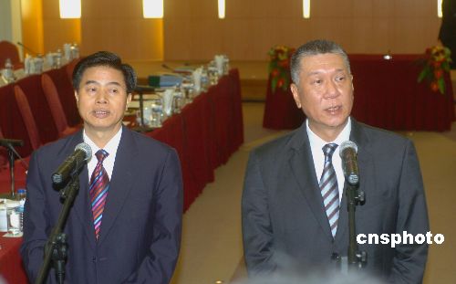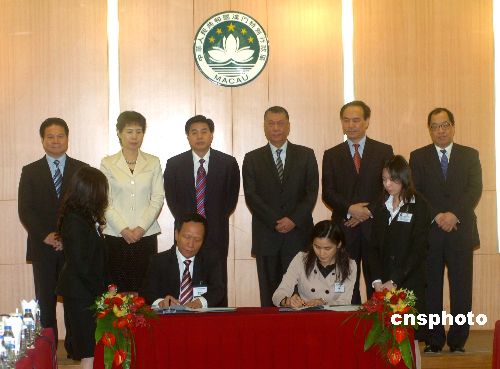 十二月十三日,澳門特別行政區(qū)政府與廣東省人民政府在澳門政府總部分別簽署了《粵澳供水合作框架協(xié)議》、《粵澳緊急醫(yī)療和消防救援合作機制協(xié)定》、《粵澳食品安全工作交流與合作框架協(xié)議》和《粵澳中醫(yī)藥產(chǎn)業(yè)合作框架協(xié)議》四項合作項目協(xié)議書。澳門特首何厚鏵、廣東省省長黃華華等嘉賓見證簽字儀式。中新社發(fā) 史利 攝
