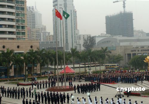 十二月二十日清晨,澳門蓮花廣場舉行隆重的升旗儀式,慶祝澳門特別行政區(qū)成立八周年。澳門特首何厚鏵、中央人民政府駐澳門聯(lián)絡(luò)辦公室主任白志健及各界人士出席升旗儀式。中新社發(fā) 史利 攝