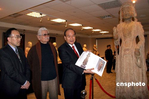 一月四日,臺(tái)灣中華皇家藝術(shù)博物館館長(zhǎng)高崇云博士(左三)向觀眾介紹該館鎮(zhèn)館之寶——國(guó)寶級(jí)文物“大勢(shì)至菩薩”石像,并與山東省青州市龍興寺一九九六年出土的一尊“大勢(shì)至菩薩”進(jìn)行比較。由該館推出的“中華瑰寶系列——宋朝漢白玉十八羅漢特展”當(dāng)日在臺(tái)北開展。據(jù)考證,這尊高一百九十八厘米、石灰石貼金敷彩“大勢(shì)至菩薩”為東魏至北齊年間作品,距今約一千六百年至一千四百年。中新社發(fā) 孫自法 攝