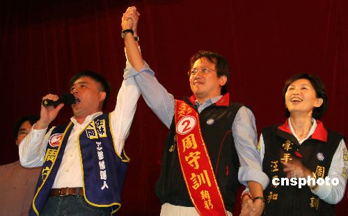 一月十日晚,臺北市市長郝龍斌參加“立委”候選人周守訓(xùn)拉票造勢晚會,為周參選站臺、打氣。臺灣“立委”選舉在即,選戰(zhàn)已進入白熱化。中新社發(fā) 孫自法 攝