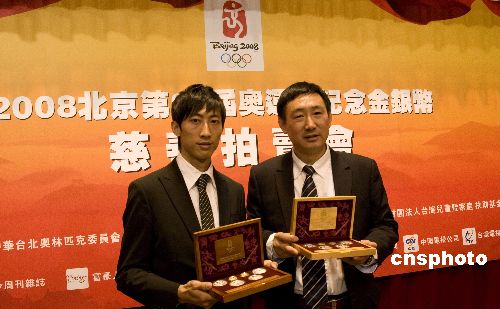 由中國臺(tái)北奧委會(huì)和臺(tái)灣大洋金銀幣有限公司共同主辦的“二00八北京第二十九屆奧運(yùn)會(huì)紀(jì)念金銀幣慈善拍賣會(huì)”,將于一月二十七日下午在臺(tái)北信義誠品店展演廳登場,拍賣所得和拍賣底價(jià)的價(jià)差,將全數(shù)捐給財(cái)團(tuán)法人臺(tái)灣兒童暨家庭扶助基金會(huì),幫助弱勢兒童過好年。圖為臺(tái)灣的上屆奧運(yùn)跆拳道冠軍朱木炎(左一),與臺(tái)灣大洋金銀幣有限公司總經(jīng)理畢海(右一),在一月二十五日的記者會(huì)上展示將拍賣的二00八北京奧運(yùn)貴金屬金銀紀(jì)念幣。中新社發(fā) 陳立宇 攝