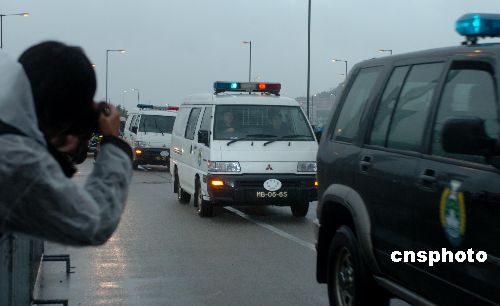 押解歐文龍的囚車(白色)在警車的護(hù)衛(wèi)下駛?cè)氚拈T終審法院。