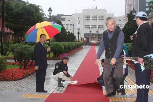 2月1日是臺(tái)灣第七屆“立法委員”辦理報(bào)到并宣誓就職的日子。清晨,臺(tái)灣“立法院”的工作人員冒雨從大門口開始鋪設(shè)通到“議場(chǎng)”的、長達(dá)百米的紅地毯。中新社發(fā) 耿軍 攝