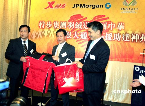 風(fēng)雪無情人有情,中國大陸南方雪災(zāi)繼續(xù)牽動(dòng)眾多同胞的心。二月四日,中國運(yùn)動(dòng)服裝品牌特步國際向雪災(zāi)嚴(yán)重地區(qū)江西省捐贈(zèng)五千件總價(jià)值人民幣二百萬元的羽絨服,協(xié)助災(zāi)民疏緩眼前困境。圖為特步國際董事長丁水波(中)、中國扶貧基金會(huì)副秘書長楊青海(左)、摩根大通亞太地區(qū)股本資本市場(chǎng)主管吳繩祖出席香港的捐贈(zèng)儀式。中新社發(fā) 王麗南 攝