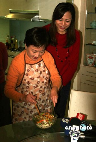 新春將至,臺(tái)灣二00八年“大選”國(guó)民黨副參選人蕭萬(wàn)長(zhǎng)的夫人朱俶賢(左),二月五日下午在友人家中做拿手菜“十全十美”,向民眾祝賀新年。中新社發(fā) 徐長(zhǎng)安 攝