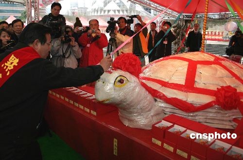 二月十五日,二00八臺北花燈節(jié)開幕,澎湖縣天后宮媽祖受邀前來。按照當?shù)刈诮虃鹘y(tǒng),澎湖人員在花燈節(jié)現(xiàn)場造乞龜臺一座,舉行點青官為“元宵乞龜”點青儀式。中新社發(fā) 徐長安 攝