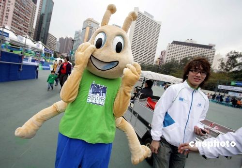 香港渣打馬拉松將在周日舉行,十六日,組委會在維多利亞公園舉行“為地球而跑—環(huán)保祝賀行動”,呼吁推動環(huán)保。圖為吉祥物穿梭會場宣傳助興。中新社發(fā) 洪少葵 攝