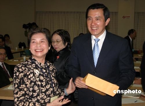 中國國民黨臺灣地區(qū)領(lǐng)導(dǎo)人候選人馬英九(中)出席會議并發(fā)表講話。