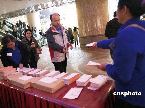 二月二十七日,香港財政司司長曾俊華向立法會提交二零零八至零九年度財政預(yù)算案,公布政府綜合盈余達(dá)一千一百五十六億元,創(chuàng)歷來新高,并推出多項減稅和惠及社會的措施。圖為有關(guān)組織街頭派發(fā)財政預(yù)算案摘要小冊子給市民。中新社發(fā) 王麗南 攝