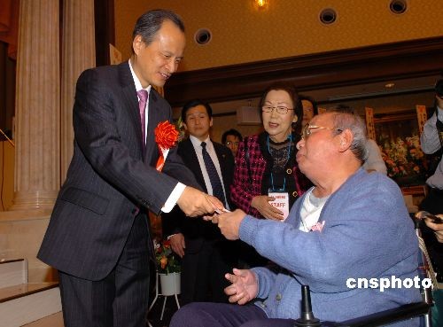 2月27日晚上,日本橫濱華僑總會舉行“2008新春聯(lián)歡會”,中國駐日大使崔天凱,日本華僑華人聯(lián)合總會會長曾德深、日本中華總商會會長黃耀庭、橫濱華僑總會會長任政光等出席,來自東京、橫濱地區(qū)的華僑華人近600人參加。圖為聯(lián)歡會上崔天凱大使按照日本習(xí)慣向老人贈送新春“紅包”,祝老人健康長壽。中新社發(fā) 滕劍峰 攝