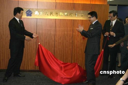 三月十二日,臺灣海基會董事長洪奇昌(右二)、“陸委會主委”陳明通(右一)、;鶗貢L游盈隆(左一)為;鶗䞍砂度嗣窦彪y服務(wù)中心揭牌。中新社發(fā) 曾嘉 攝