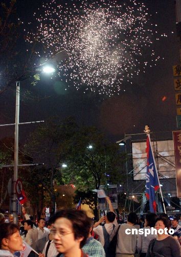 3月22日,中國國民黨候選人馬英九、蕭萬長在臺灣地區(qū)領(lǐng)導(dǎo)人大選中以221萬票的領(lǐng)先優(yōu)勢獲勝。圖為當(dāng)日晚間在馬蕭競選總部前的集會上,支持者放焰火慶祝。中新社發(fā) 黃少華 攝