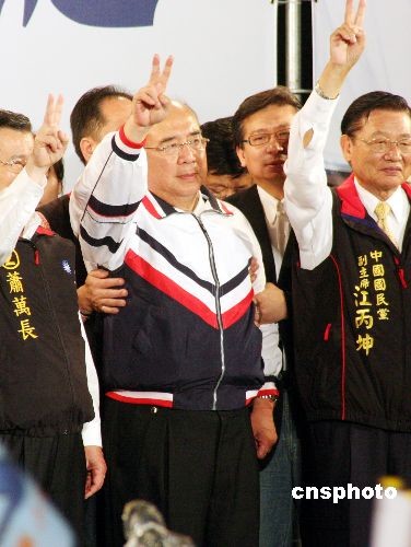 3月22日,臺(tái)灣舉行大選投票,結(jié)果中國(guó)國(guó)民黨候選人馬英九、蕭萬(wàn)長(zhǎng)以221萬(wàn)票的領(lǐng)先優(yōu)勢(shì)獲勝,當(dāng)晚大批支持者在馬蕭競(jìng)選總部前集會(huì)歡慶。圖為中國(guó)國(guó)民黨主席吳伯雄在現(xiàn)場(chǎng)慶祝時(shí),曾由他人幫忙攙扶。連日的輔選,使吳伯雄體力超支。中新社發(fā) 黃少華 攝