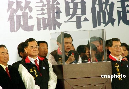 3月22日,臺灣舉行大選投票,結(jié)果中國國民黨候選人馬英九、蕭萬長以221萬票的領(lǐng)先優(yōu)勢獲勝,當(dāng)晚大批支持者在馬蕭競選總部前集會歡慶。圖為馬英九在蕭萬長、國民黨榮譽(yù)主席連戰(zhàn)、主席吳伯雄、親民黨主席宋楚瑜、“立法院長”王金平陪同下,在現(xiàn)場發(fā)表演講。中新社發(fā) 黃少華 攝