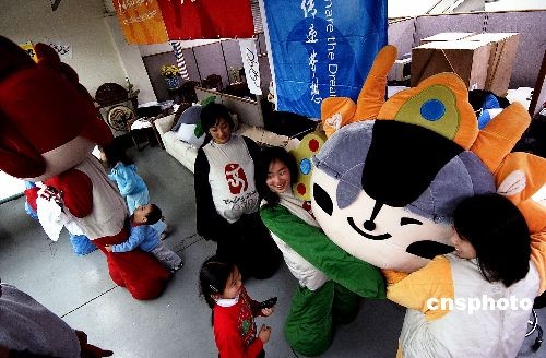 首次見到奧運福娃的美國華裔兒童雀躍歡呼