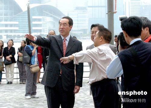 四月十八日,香港舉行奧運火炬?zhèn)魉蜏y試,香港政務(wù)司長唐英年在尖沙咀文化中心起步點視察奧運火炬?zhèn)魉蜏y試。作者: 鄧慶樂