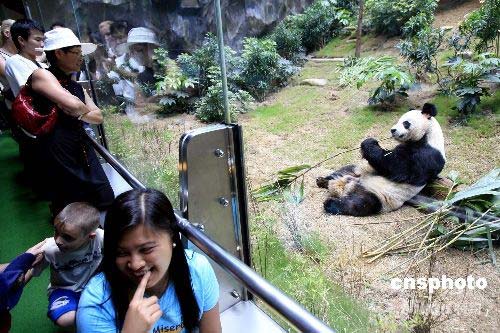 四月二十六日是大熊貓盈盈及樂樂到港一周年紀(jì)念日,香港海洋公園將于四月二十六日至五月三十一日推出“尋找熊盈樂”香港身份證推廣優(yōu)惠活動(dòng)。凡身份證或出生證明書上的名字印有“熊”、“盈”、“樂”或“P 、A 、N 、D、 A”的其中一個(gè)字母,即可享有購海洋公園日間入場(chǎng)門券八折優(yōu)惠,并有十人獲得雙人探訪“四川大熊貓基地”之旅。圖為二十二日游人在海洋公園觀賞大熊貓憨態(tài)可掬的吃竹子。中新社發(fā) 王麗南 攝