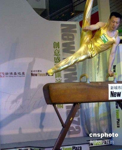 四月三十日,沙田一商場為慶祝奧運(yùn)馬術(shù)比賽在香港舉行,特別邀請亞特蘭大奧運(yùn)會(huì)鞍馬冠軍李東華作表演。李東華作為瑞士2008年奧運(yùn)會(huì)國家代表團(tuán)的特使,為瑞士贏得近百年來的首枚體操奧運(yùn)金牌。中新社發(fā) 譚達(dá)明 攝