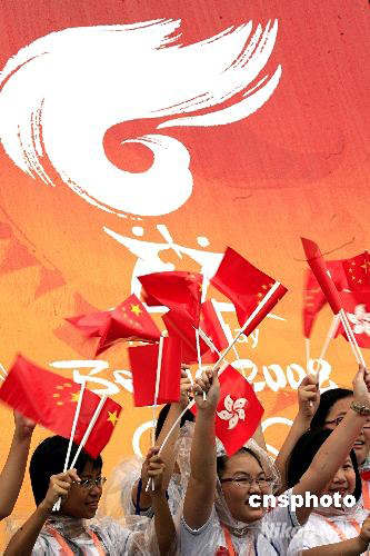 當?shù)貢r間五月二日十點半,2008北京奧運圣火中國境內(nèi)首站香港傳遞正式開始。眾多香港學生手執(zhí)國旗、區(qū)旗在尖沙咀火炬起跑地歡呼。中新社發(fā) 王麗南 攝