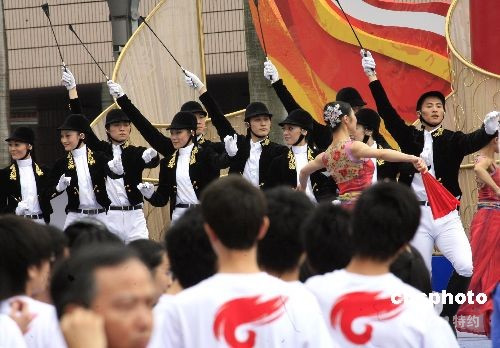 五月二日上午,2008北京奧運(yùn)圣火中國境內(nèi)首站(香港)傳遞正式開始,尖沙咀火炬起跑點(diǎn)舉行盛大開跑儀式,穿著馬術(shù)服裝的演員表演舞蹈。中新社發(fā) 王麗南 攝