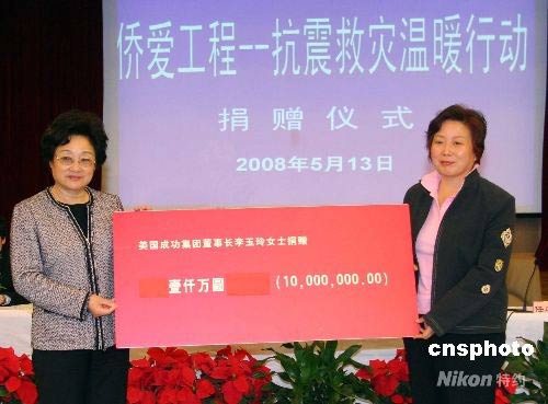5月13日,國務(wù)院僑辦舉行“僑愛工程--抗震救災(zāi)溫暖行動”捐款儀式,海外華商代表向國務(wù)院僑辦李海峰主任轉(zhuǎn)交了救災(zāi)善款。目前僑辦共收到泰國正大集團、美國成功集團董事長李玉玲女士等各界僑商的捐款共計6850萬元人民幣。圖為國務(wù)院僑辦李海峰主任(左)接受美國成功集團董事長李玉玲女士(右)捐贈的1000萬元人民幣。