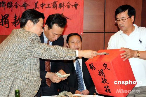 當(dāng)?shù)貢r(shí)間十四日晚,四十一位閩籍華僑在華盛頓中國(guó)城發(fā)起四川大地震賑災(zāi)募捐,十分鐘現(xiàn)場(chǎng)捐款就達(dá)二萬(wàn)一千多美元。圖為美國(guó)福建同鄉(xiāng)聯(lián)合會(huì)僑胞積極為四川災(zāi)區(qū)捐款,表達(dá)愛(ài)心。中新社發(fā) 邱江波 攝