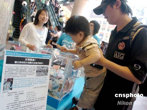 五月十五日,聯(lián)合國兒童基金會香港委員會在香港銅鑼灣時代廣場設(shè)立籌款站,為四川地震災(zāi)區(qū)籌款。圖為一對父子路過籌款站,慷慨解囊。四川發(fā)生大地震后,香港各界積極發(fā)起籌款賑災(zāi),向四川災(zāi)區(qū)伸出援手。中新社發(fā) 鄧慶樂 攝