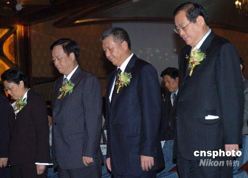五月十九日,澳門特首何厚鏵(右二)在美高梅金殿默哀,悼念四川地震遇難同胞。當日至二十一日為全國哀悼日。中新社發(fā) 史利 攝