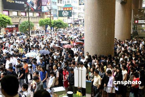 五月十九日下午二點(diǎn)二十八分,香港時(shí)代廣場眾多市民停住匆忙的腳步,為四川汶川大地震遇難同胞默哀三分鐘。中新社發(fā) 王麗南 攝