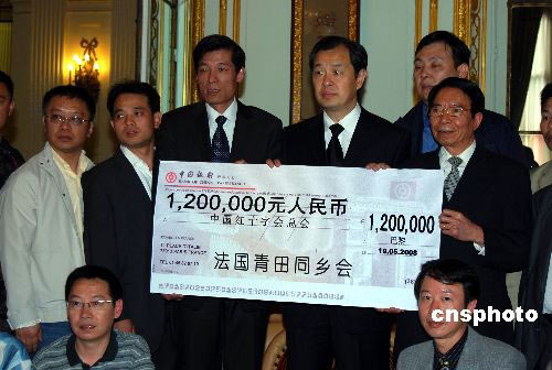 法國(guó)青田同鄉(xiāng)會(huì)十九日通過中國(guó)駐法大使館,向四川地震災(zāi)區(qū)捐款,支持抗震救災(zāi)。至今,旅法僑胞向四川地震災(zāi)區(qū)捐款已超過一千萬元人民幣。中新社發(fā) 吳衛(wèi)中 攝
