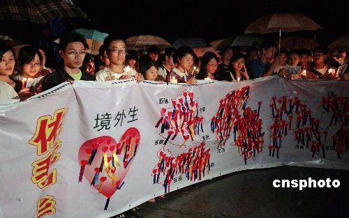 5月19日中國(guó)全國(guó)哀悼日,福建華僑大學(xué)學(xué)子點(diǎn)起蠟燭,齊唱《讓世界充滿愛(ài)》為四川地震受難者祈禱。圖為在校境外學(xué)生手拉條幅,為逝者哀悼、為生者加油。中新社發(fā) 傅丹丹 攝